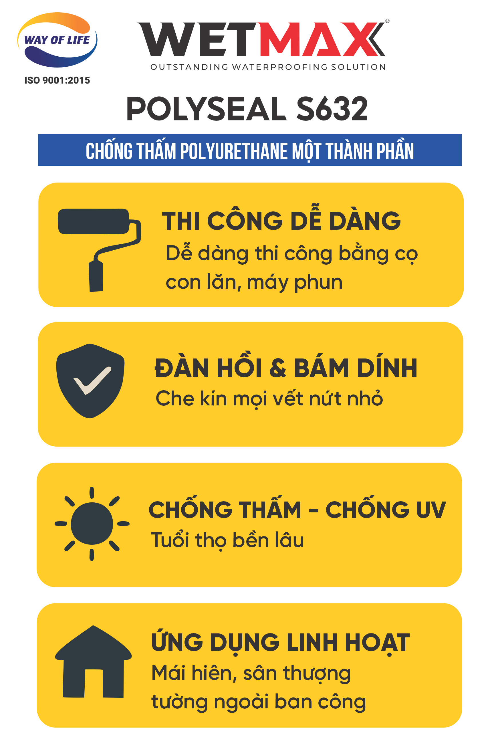 WETMAX POLYSEAL S632 chính là lựa chọn tối ưu nếu bạn cần giải pháp chống thấm bền lâu, đàn hồi, và hiệu quả vượt trội. Với công nghệ Polyurethane – Acrylic cải tiến, sản phẩm đảm bảo chống thấm hoàn hảo, bám dính tuyệt hảo và tuổi thọ vượt thời gian.
